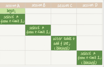 • 如上图,A,B都可以正常申请到读锁,不互斥;当alter添加表字段时增加写锁,D申请不到读锁。当业务有多个重试,连接可能很快爆满导致挂掉---解决:alter table 内设定等待时间,拿不到先放弃ALTER TABLE tbl_name WAIT N add column ...